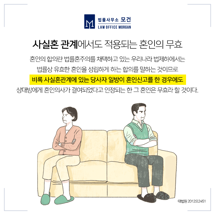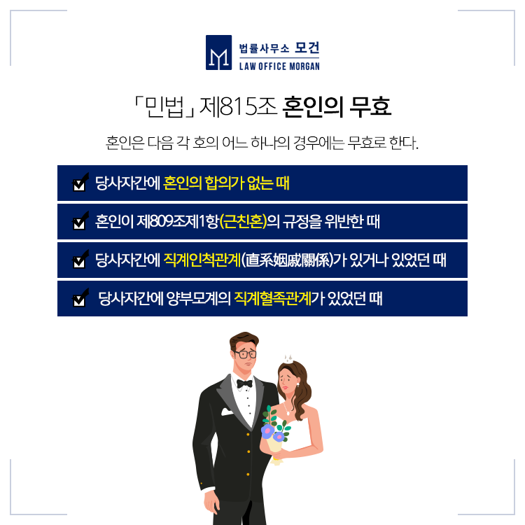 「민법」 제815조에서는 총 4가지의 혼인의 무효사유를 두고 있는데요. 가장 대표적인 사유로는 '당사자 간에 혼인의 합의가 없는 때'입니다. 여기서 혼인의 합의란 ‘당사자 사이에 부부관계로서 인정되는 정신적· 육체적 결합을 할 의사 및 법률상 유효한 혼인을 성립하게 할 의사의 합치’를 의미합니다.
