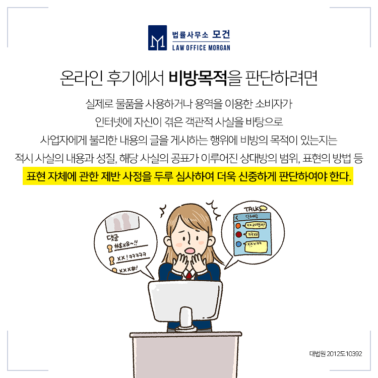 특정 업체 또는 상품에 대한 자신의 경험담을 적은 '인터넷 후기'가 때로는 법적분쟁에 휘말리게 하기도 합니다. 부정적인 후기에 대해 많은 업체들이 브랜드 이미지 실추, 영업방해, 매출저하 등을 이유로 강력하게 대응하고 있기 때문인데요. 그렇다면 소비자는 좋은 후기만을 게재할 수 있고, 부정적인 후기는 게재할 수 없는 것일까요?