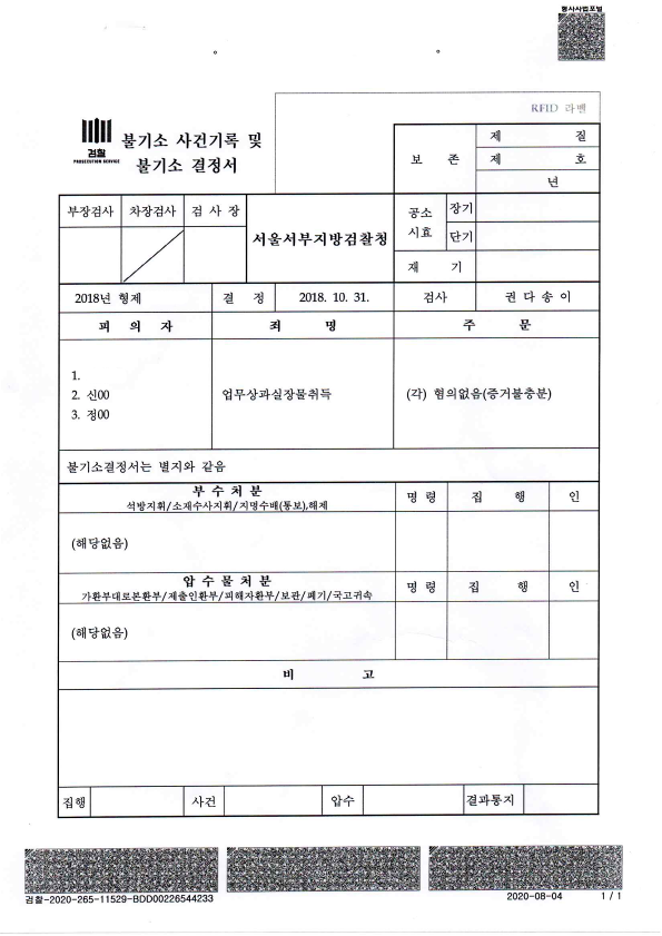 법률사무소 위너스 이주윤 변호사는 형사 변호사로서 검찰 조사에 입회하여 동석하고, 변호인 의견서를 통하여 대법원에서 유죄로 판단된 사례와 당해 사건의 차이점을 부각하고, 피의자에게 업무상 과실이 없음을 세심하게 주장하고 증명한 결과, 업무상과실장물죄에 대하여 혐의없음(증거불충분) 처분을 받아 냈습니다.