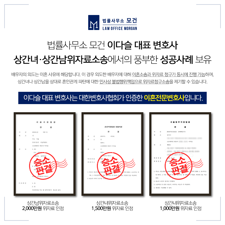 종로/을지로/마포 이혼전문변호사인 이다슬 대표 변호사는 다양한 상황의 상간녀소송, 상간남소송에서 의뢰인의 소송대리인으로서 승소한 풍부한 사례를 갖추고 있습니다. 특히 부정행위에 대한 직접적인 증거가 없는 상황 속에서도 특유의 치밀함과 전략을 내세워 승소를 이끌어낸 사례도 갖추고 있으니 우선 이혼전문변호사인 이다슬 대표 변호사의 법률자문을 통하여 어떤 준비가 필요한지 자세히 알아보시기 바랍니다.