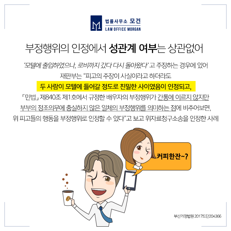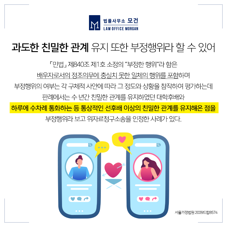 그런데 이런 관계가 자칫 잘못된 부정행위, 불륜행위로 나아가는 경우에는 불법행위를 구성하기 때문에 이를 이유로 상대 배우자는 이혼소송 및 위자료청구소송을 제기할 수 있고, 배우자와 불륜행위를 한 상간녀, 상간남을 상대로 위자료청구소송을 제기할 수 있습니다.