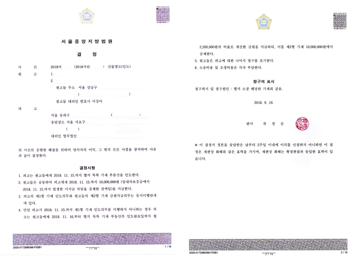 민사소송 잘하는 변호사! 법률사무소 위너스에서는 확정판결과 동일한 효력을 갖는 강제조정결정을 신속하게 이끌어 냈고 및 즉시 명도집행에 착수하여 임대인의 손실을 최소화해드린 사례입니다.
