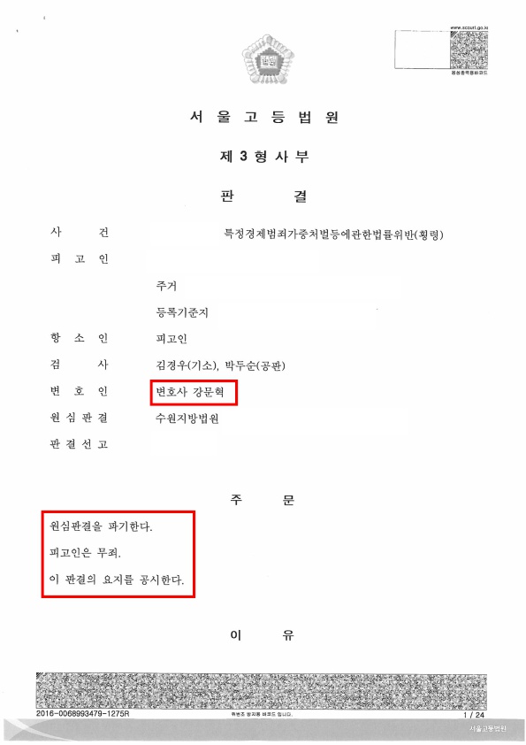 서울고등법원 항소심 재판부는 피고인에 대한 1심 판결을 취소하고 피고인에게 무죄를 선고하였습니다.