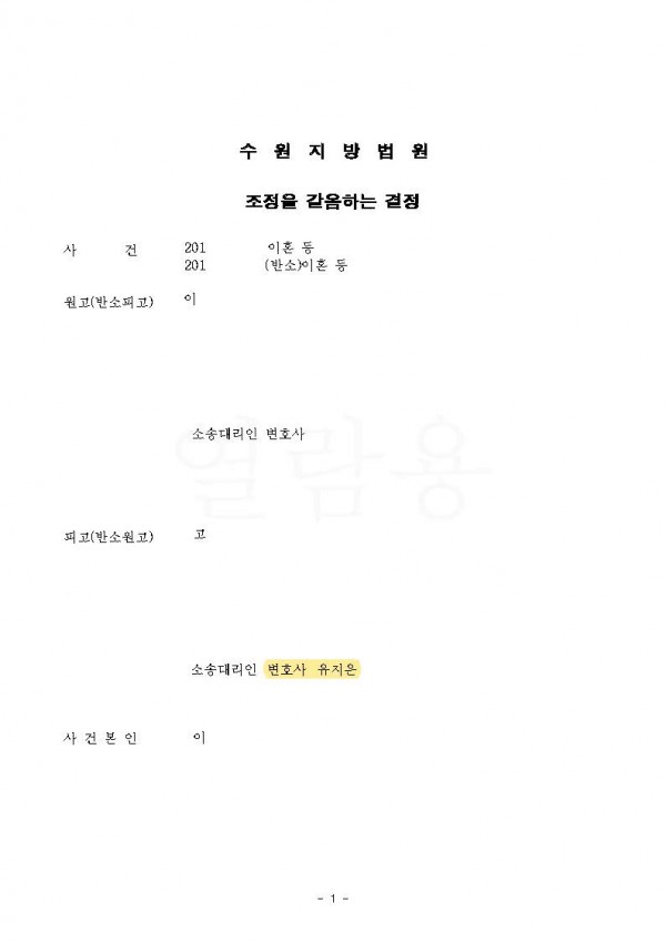 이처럼 이혼 소송 중에도 이혼하지 아니하고 별거하면서 상호 관계 개선을 위해 노력한다는 내용의 조정 성립도 얼마든지 가능합니다. 이 사건은 별거 중인 기간에도 아이의 양육자로 의뢰인이 지정되었고, 아이 양육비로 통상적으로 인정되는 양육비 액수보다 많은 월 200만 원이 인정되었으며, 이 외에도 남편으로부터 3천만 원을 추가로 지급 받는 내용으로 상대방과 원만히 합의가 성립하여, 결국 남편이 소를 제기한 지 4개월 만에 의뢰인이 원하는 내용대로 잘 마무리된 사안입니다.
