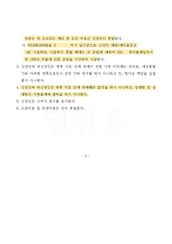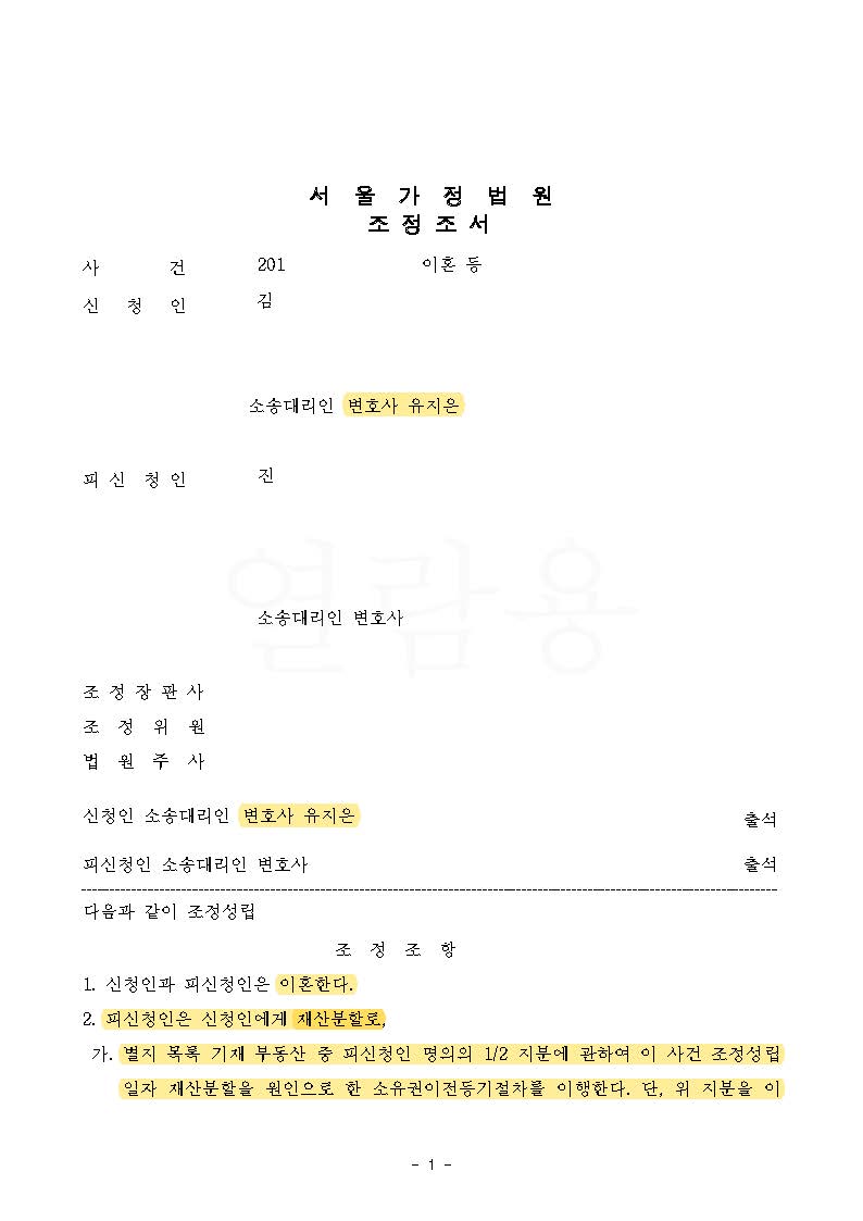 이에 상대방 대리인과 수차례 통화를 하며 합의를 시도하였고, 조정기일 전에 남편의 재산을 조회하여 분할대상 재산 정리를 마쳤습니다.