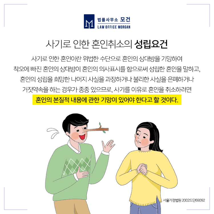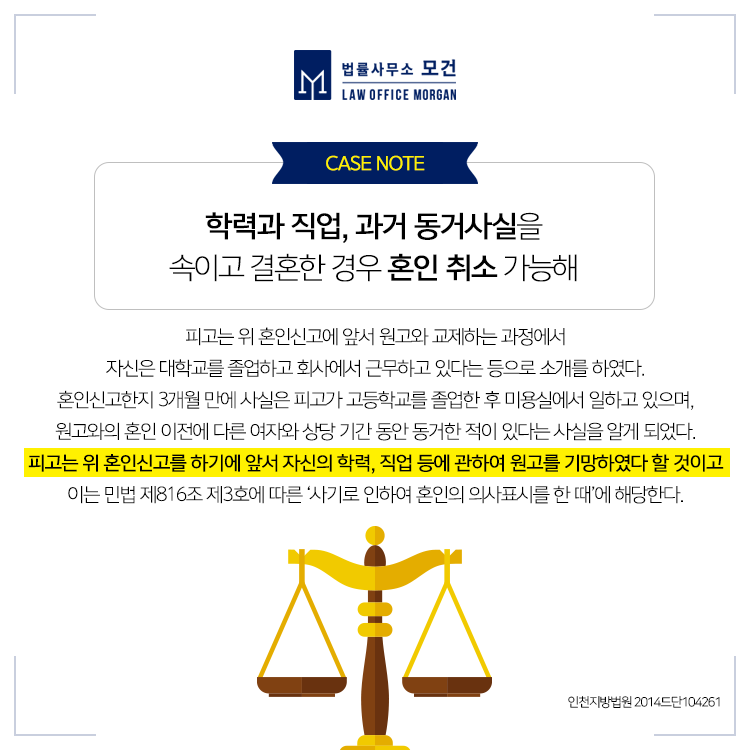 사기로 인한 혼인이란 상대방을 '기망'함으로써 착오에 빠진 상대방이 혼인의 의사표시를 함으로써 성립한 혼인을 말합니다. 학력, 가족관계, 직업 등에 관하여 상대방을 속이고 결혼한 경우, 혼인신고 당시 이를 알지 못했던 당사자가 만약 이러한 사실을 알았더라면 상대방과 혼인신고를 하지 않았을 것으로 보일 때 「민법」 제816조 제3조 소정의 혼인취소 사유인 '사기로 인하여 혼인의 의사표시를 한 때'에 해당한다고 볼 수 있습니다.
