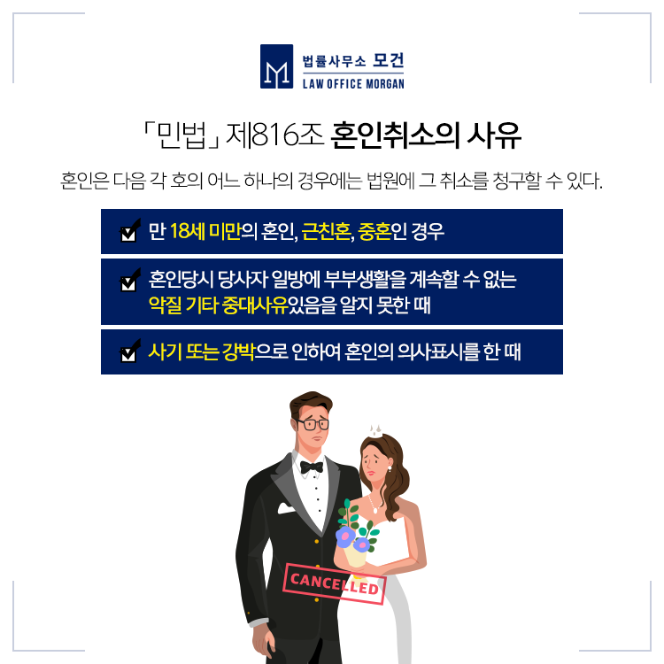 지난 포스팅에서 '혼인무효소송'에 대해 알아보았는데요. 혼인무효소송처럼 혼인의 취소가 가능한 경우가 「민법」 으로 규정되어 있어 해당 사유에 충족되지 않을 시에는 혼인취소가 불가능합니다. 혼인취소가 가능한 사유 중 치열한 법적 다툼이 진행되는 경우는 ① 사기, 강박으로 혼인한 경우 ② 부부생활을 계속할 수 없는 악질 기타 중대사유가 있는 경우입니다.