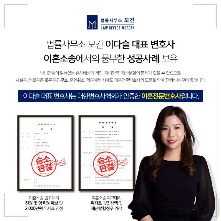 종로/동대문/용산 이혼전문변호사인 이다슬 대표 변호사는 이혼 및 위자료소송에 다수의 성공사례를 보유하고 있습니다. 이혼과 관련한 사항은 지극히 개인적인 사정과 이야기이기 때문에 가급적이면 변호사와의 1:1 방문상담을 권장해드립니다. 관련 상담이 필요하신 분들은 아래 전화 또는 카카오톡 등으로 문의하시기 바랍니다.