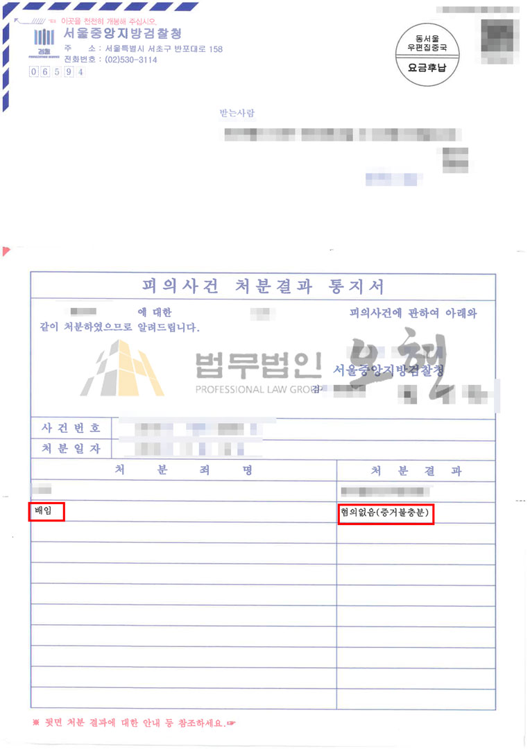 ※본 사건의 1. 처분 문서 일부, 2.변호인 의견서 일부를 첨부합니다. 본 성공 사례 및 첨부자료의 무단 도용을 금합니다.