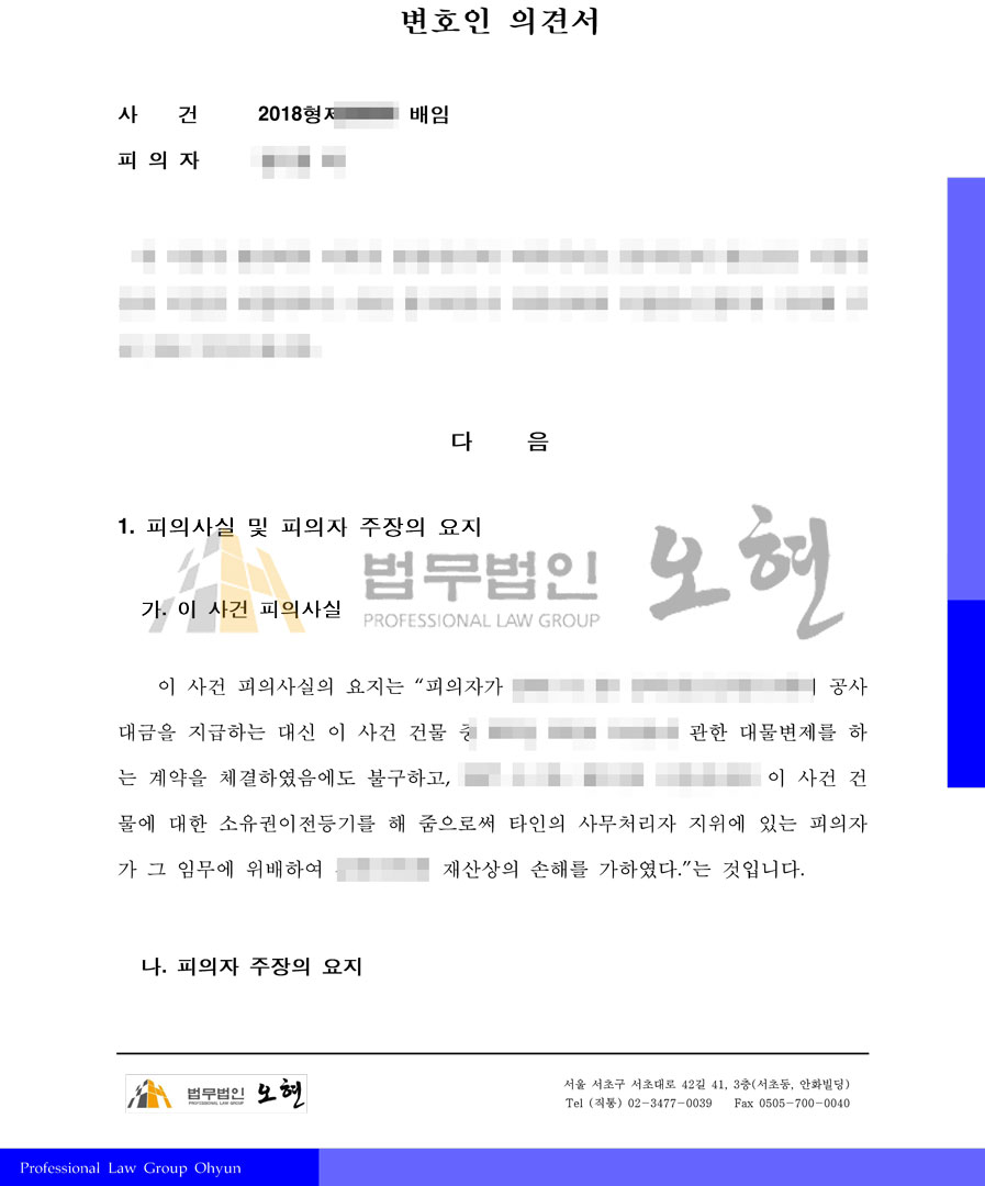 사안의 경우 대물 변제의 약정이 유효하지 않다면 어떠한 법리를 적용하더라도 배임으로 볼 수가 없기 때문에, 본 법무법인은 대물변제 약정의 효력에 대해 집요하게 다투었습니다. 이러한 결과는 민사와 형사의 총체적인 분석이 전제되어야 가져올 수 있는 것으로 초기에 반드시 올바른 변론 방향 설정을 해야합니다.