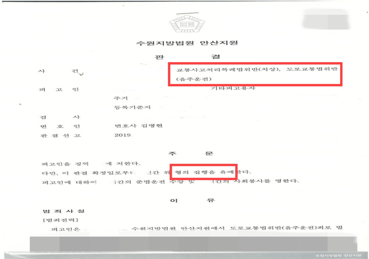 오늘은 음주운전 3진아웃의 피의자가 설상가상으로 교통사고상해사건까지 일으킨 형사사건에 대하여 집행유예로 방어한 사건에 대하여 연구해보도록 하겠습니다.