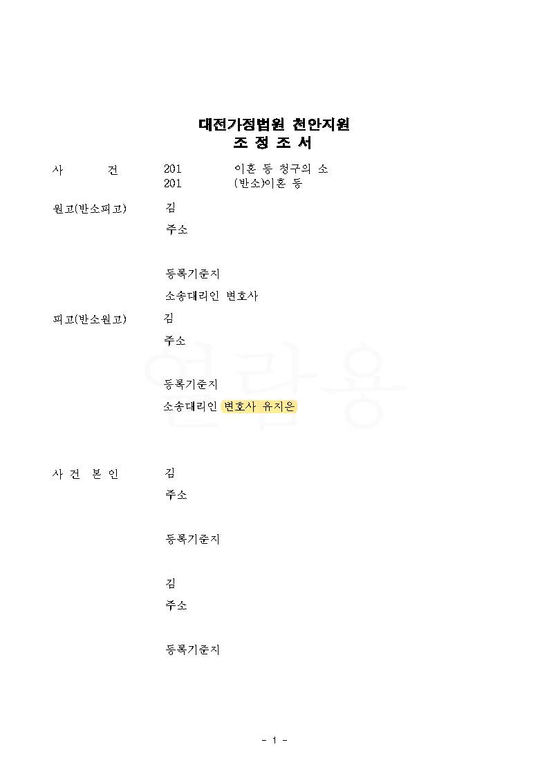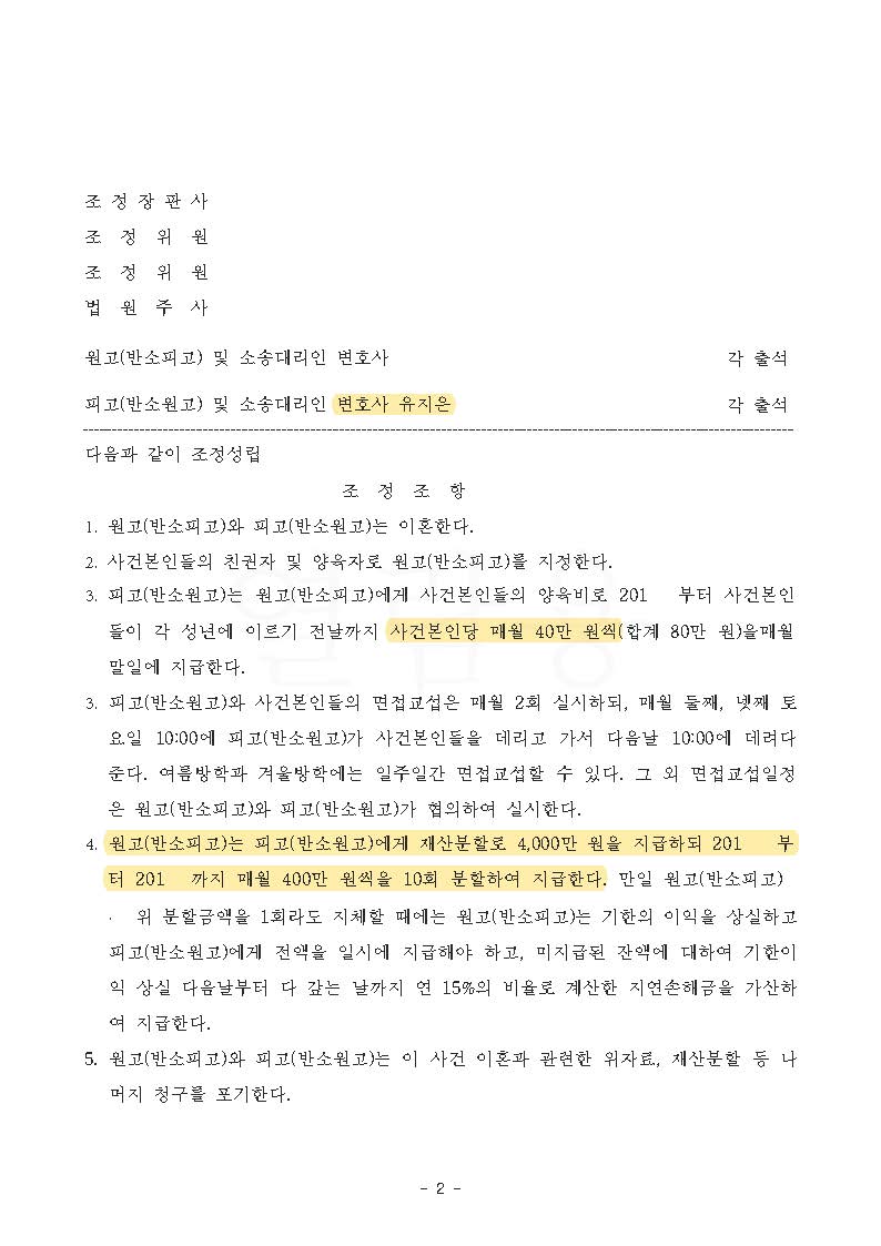 뿐만 아니라 남편은 장래 양육비로 아이 한 명당 100만 원의 양육비를 청구하였는데, 의뢰인이 현재 수입이 일정하지 않은 점을 강조하여 지급해야 할 장래 양육비를 1인당 40만 원으로 감액하는 내용으로 원만히 합의가 성립하였고, 결국 의뢰인이 바라는 대로 성공적으로 조정이 성립된 사안입니다.