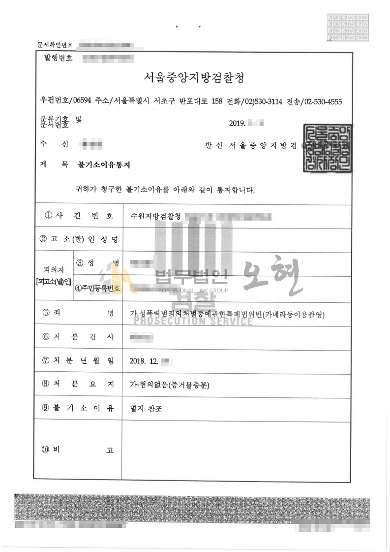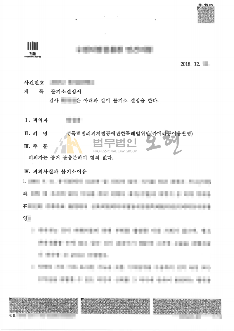 본법무법인은 의뢰인의 카메라 촬영 혐의에 대하여 참고인들의 진술증거의 신빙성을 다투면서 의뢰인의 진술의 신빙성이 더 높다는 점에 대한 변론을 하였습니다. 또한 판례를 분석하여 해당 혐의가 인정되기 위해서는 여러 가지 종합적인 정황들을 구체적이고 상대적으로 판단하여야 한다는 점을 수사기관에 강력히 변론하였습니다. 결국 검찰은 본법무법인의 변론을 받아드려 의뢰인의 혐의에 관하여 혐의없음을 선고를 하였고 이에 의뢰인의 일상생활을 지킬 수 있었습니다.