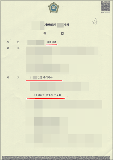 ❶피고 회사 대리인의 입장에서는 처분문서인 위 매매계약서상의 매수인으로 피고회사가 적혀져 있지만 실질적인 당사자는 피고회사가 아니라, 피고회사로부터 철근공사를 재하도급받은 조00이라는 개인건설업자임을 잘 설명하고 이를 인정하지 않을 수 없도록 증거를 잘 현출하였습니다(조00은 자신을 상대로 한 당사자본인신문에서 피고회사가 철근의 매수인이고 자신이 보증인일 뿐이라며 반대로 얘기했고 재판부가 이에 속는듯한 눈치였으나 결국 사실대로 그 반대로 인정받았습니다). ❷ 그 뿐만 아니라, 대금 1억원을 지급한 부분 또한 조00을 위해 원고에게 보증을 선 이유로 지급한 것임을 주장하였는데, 사실 보증을 선 금액(철근 100톤 6,200만원)을 초과하는 금원이라 ‘매수 당사자였기에 보증선 금액을 초과하여 지급하지 않았냐’는 의심을 받을 소지가 충분하였으나, 초과지급분은 단순히 하도급 대금의 직불의미로 지급한 부분임을 잘 설명하였습니다. ❸ 그리고 피고회사가 원고로부터 대금 전액에 관해 세금계산서를 발부받은 부분에 관하여는, 직접 거래관계가 없더라도 매입세금계산서 확보를 위해(비용증빙확보) 세금계산서를 발행하는 건설업계관행 등을 잘 설명하고, 관련 유사 증거로 분명하게 뒷받침하여 의심을 불식시킬 수 있었습니다.