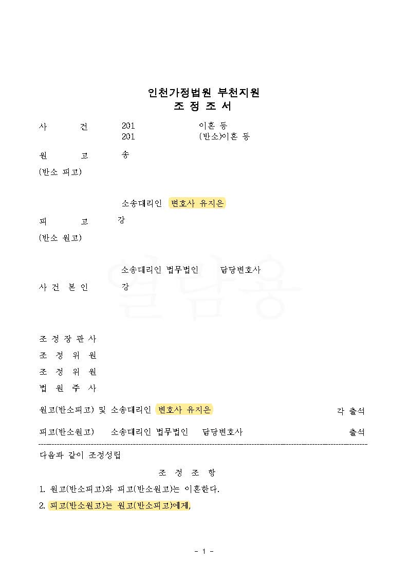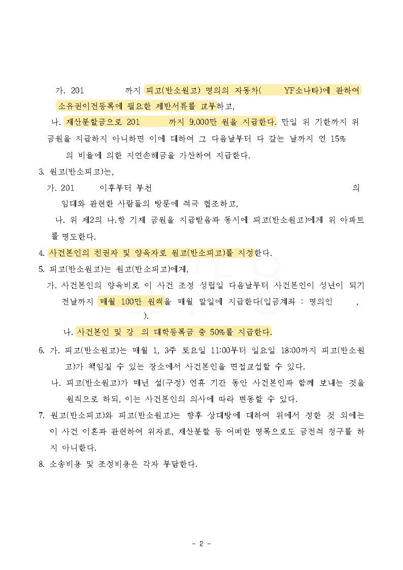결국, 의뢰인은 원하던 대로 의뢰인이 타고 다니던 남편 명의의 차량을 이전받고, 재산분할금으로 9천만 원을 받는 내용의 조정이 성립하였으며, 아이 양육비로 매달 100만 원씩 받는 것 외에도 이미 성인이 된 아이와 미성년인 아이 두 명의 대학등록금의 절반을 지원받는 내용으로 성공적으로 조정이 성립하였습니다.
