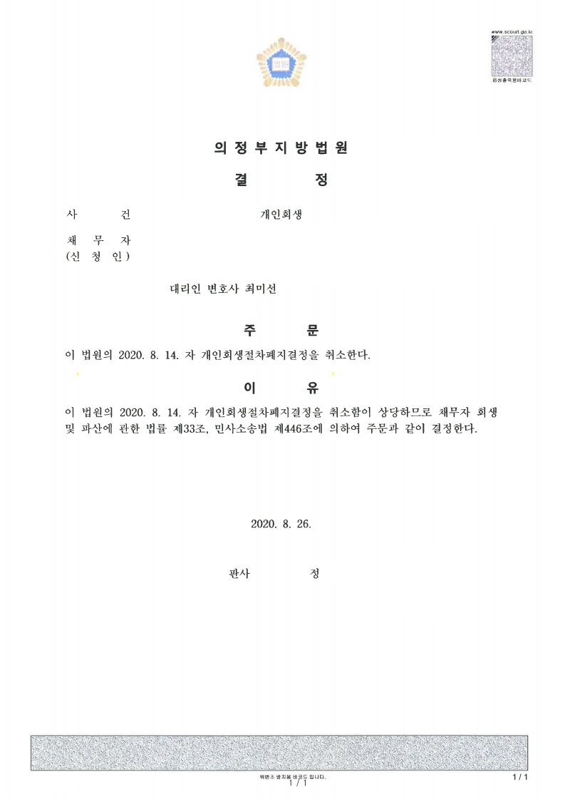 최미선 변호사는 차분히 법원에서 요구하는 서류들을 완벽히 구비해 제출하면서 서류제출이 부득이 늦어진 점에 대해 양해를 구하는 서면을 작성해 즉시항고장을 제출한 결과 의뢰인님은 기존 개인회생 개시결정을 계속 유지할 수 있게 되었습니다.