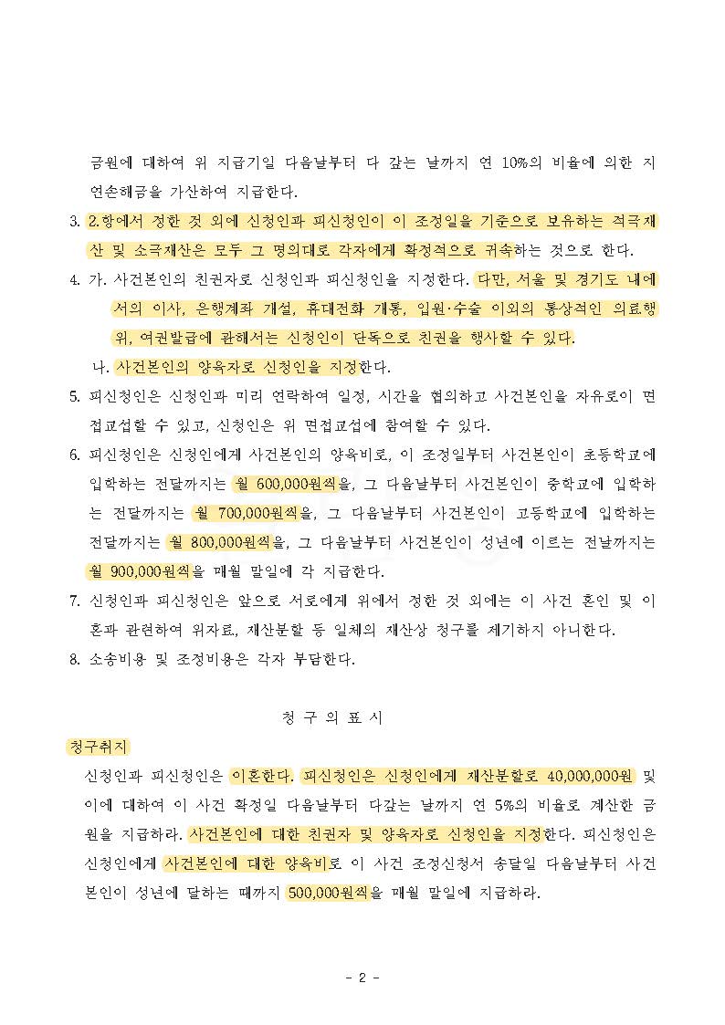 결국, 의뢰인이 조정신청서에서 청구한 내용대로 원만하게 조정이 성립하였으며, 아이가 성장함에 따라 양육비를 차등적으로 증액하는 것으로 실제 청구한 내용보다도 성공적으로 마무리 할 수 있었습니다.