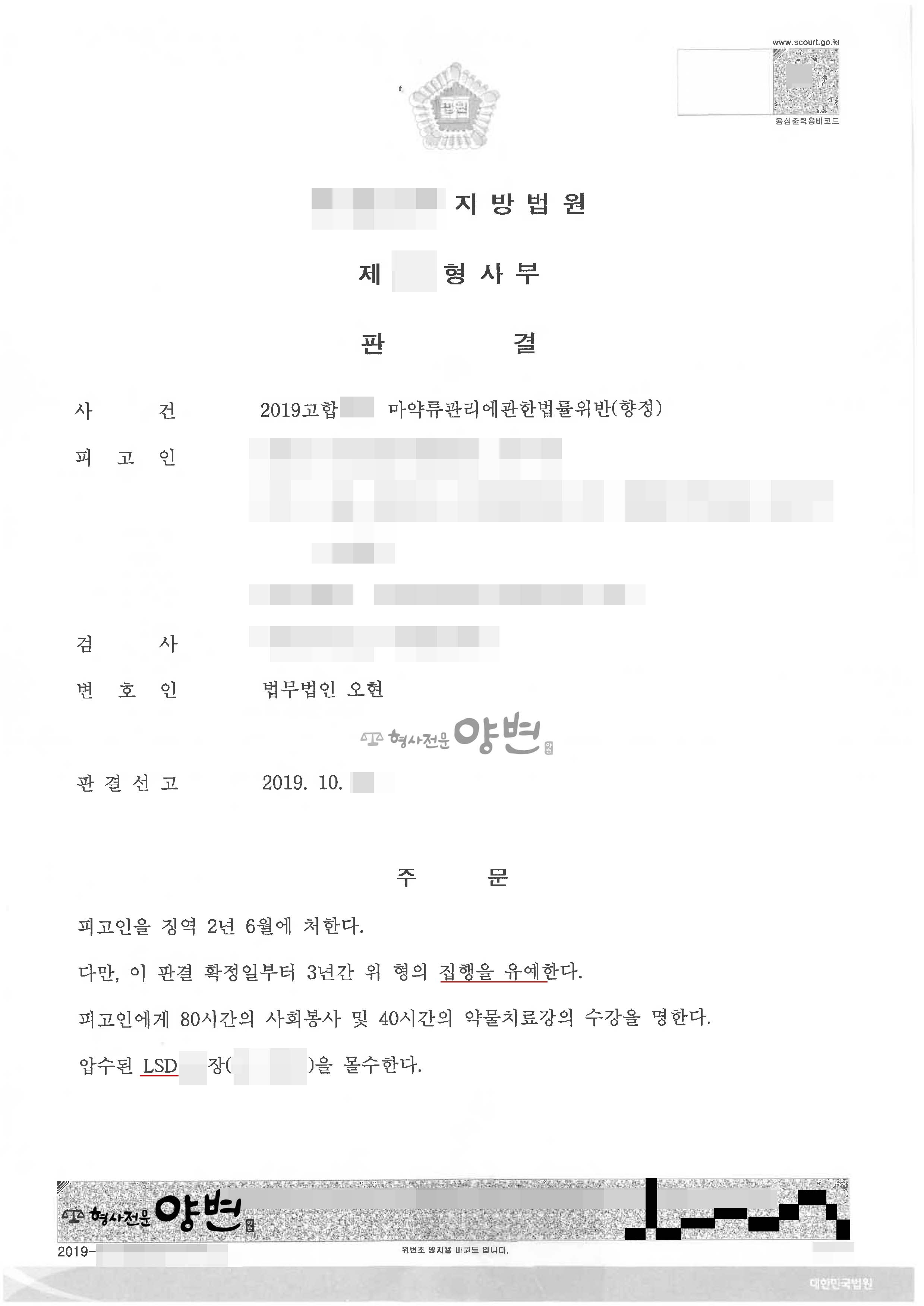 재판부는 “피고인이 환각성이 강한 마약인 LSD를 국내로 수입한 것으로 죄질이 좋지 않다.”고 하면서도 “반성하고 있는 태도를 보이고 있는 점 등을 유리한 정상으로 참작한다.”고 하면서 집행유예 선고를 하였습니다.