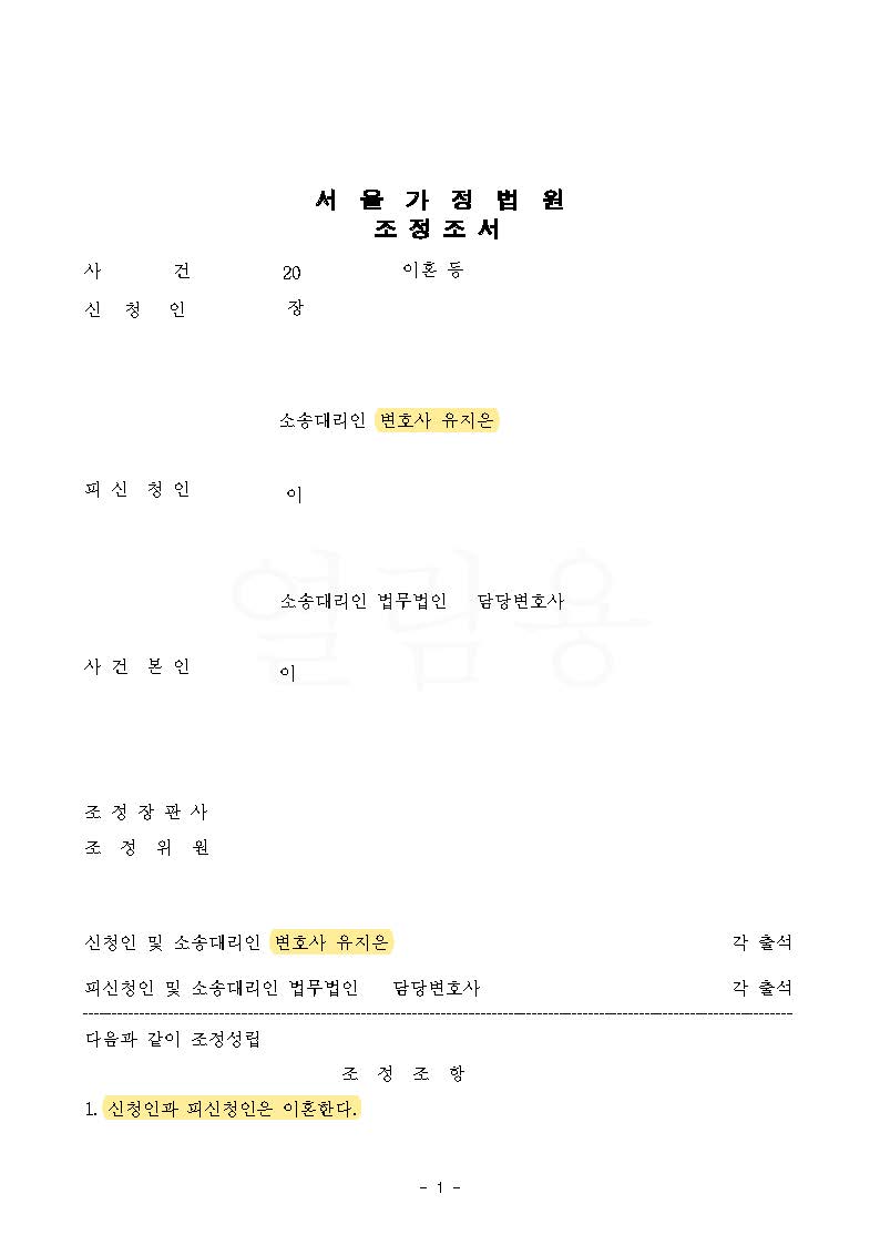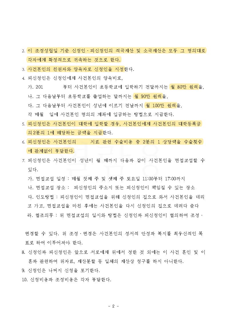 또한, 안타깝게도 아이가 사시가 있어 치료를 받아야만 했는데, 조정기일에 장시간에 걸쳐 남편을 설득하여 아이의 사시 치료 관련 수술비용 절반을 수술 횟수와 관계없이 지급 받는 내용으로 성공적으로 조정이 성립하였습니다.