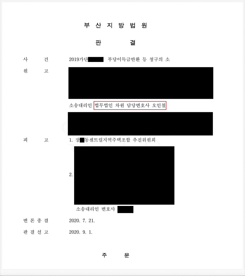 저는 지역주택조합 가입계약의 취소(해제)에 따른 금원의 부당이득반환청구 소송을 상당수 진행한 노하우가 있으며, 의뢰인의 이익을 위해 '전부 승소'의 결론을 이끌어내고 있습니다.