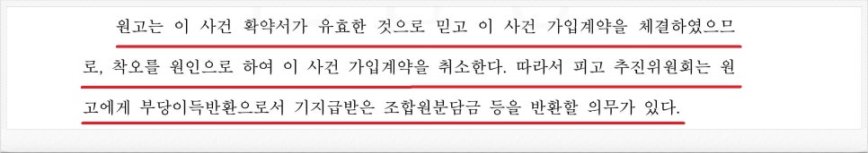 '안심보장증서(환불확약서)는 아무런 효력이 없는 휴지조각에 불과한 문서라 할 수 있는데, 이를 교부하며 의뢰인을 가입시킨 해당 지역주택조합측을 상대로는 착오를 원인으로 하여 분담금을 전액 반환받을 수 있다'라는 근거를 바탕으로 조합의 탈퇴 및 납입금의 반환을 구하는 민사소송을 제기하였습니다.