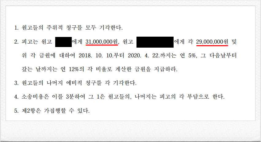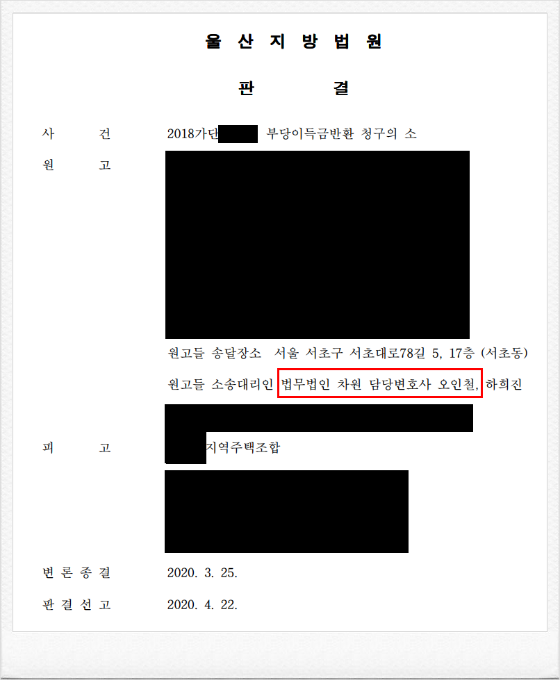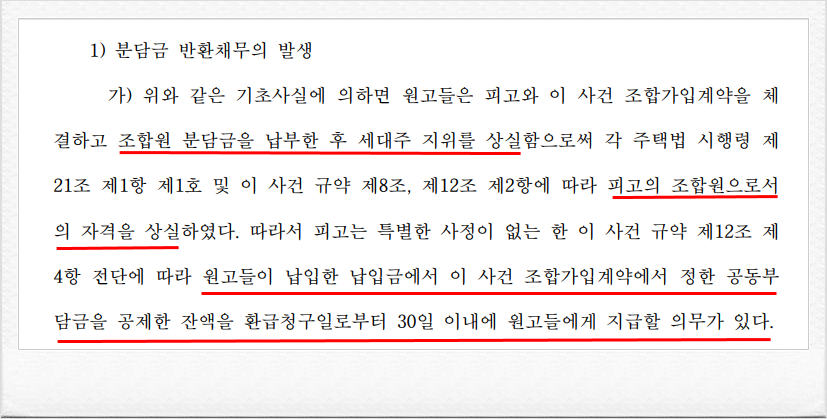결국, 재판부는 이러한 저의 주장을 받아들여, 의뢰인들의 조합원 자격 상실을 이유로 조합탈퇴를 인정하고, 지역주택조합으로 하여금 납입한 분담금을 반환할 것을 명하는 내용의 승소판결을 이끌어 내었습니다.