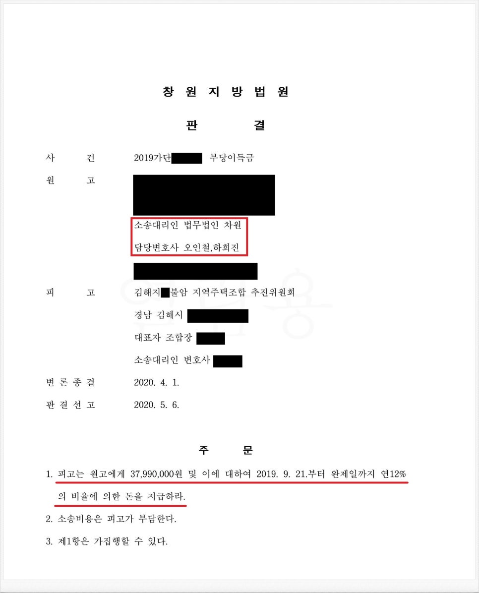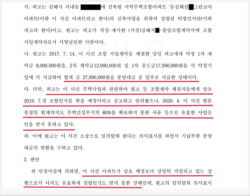 저를 찾아오신 의뢰인분께서는 경남 김해 소재의 김해지*불암 지역주택조합과 조합가입계약을 체결하시고, 해당 지역주택조합이 정상적으로 진행된다고 믿은 채 총 37,990,000 원을 계약금 및 중도금 명목으로 납입하셨습니다.
