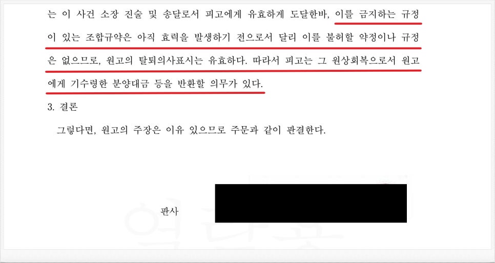 결국, 재판부는 이러한 저의 주장을 전부 받아들여, 의뢰인께서 납입한 금원 전액을 반환할 것을 명하는 내용의 판결을 이끌어 내었습니다.