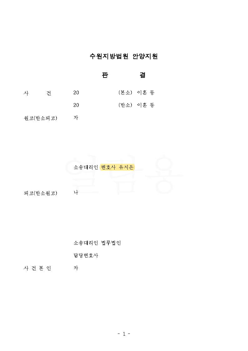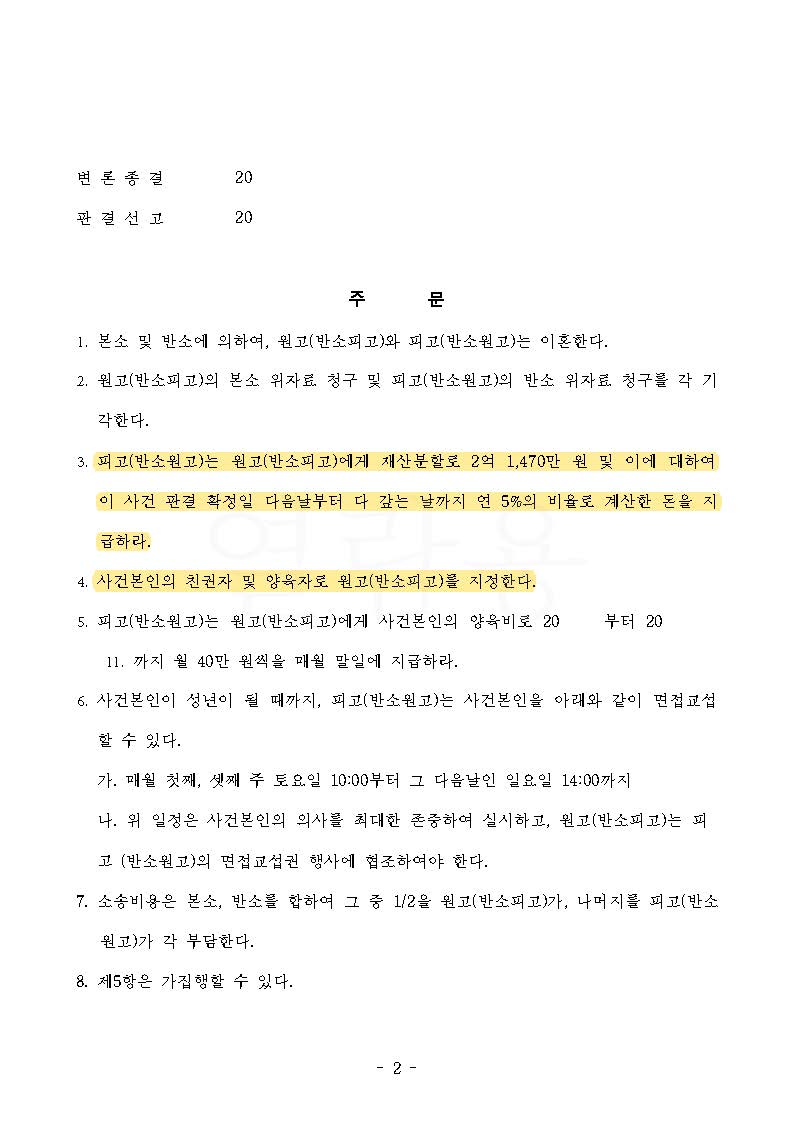 결국, 의뢰인은 재산분할 대상에 아내의 특유재산까지 전부 포함하여 60%의 재산분할 비율을 인정받아 아내로부터 재산분할로 2억 1,470만 원을 받아올 수 있었으며, 의뢰인이 아버지임에도 불구하고 아이의 친권자 및 양육자로 지정되어 성공적으로 마무리된 사례입니다.