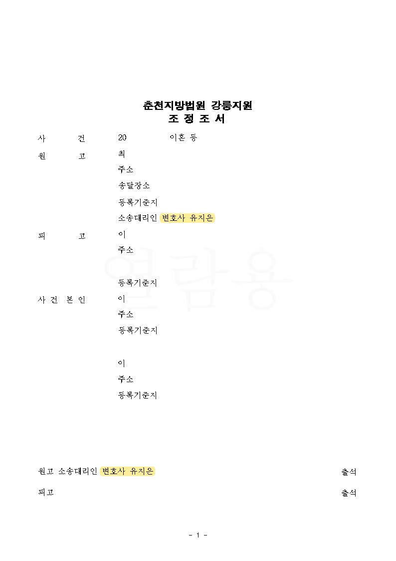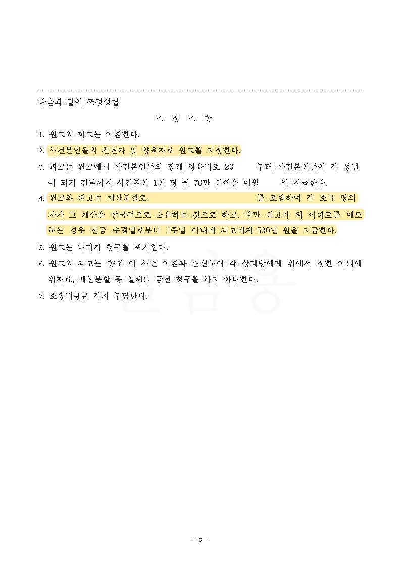 또한, 조정기일에 장시간에 걸쳐 이미 혼인 관계가 파탄되어 더는 회복될 여지가 없음을 주장하였고, 위자료 청구를 안 하는 대신 재산분할 청구를 포기하도록 남편을 적극적으로 설득하였습니다.