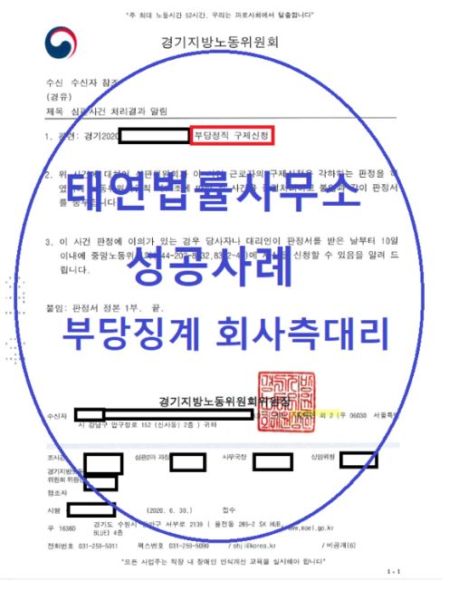 이번 사안은 근로자 측에서 회사의 징계가 부당하다는 취지로 주장을 하며, 부당징계 기간에 대한 임금청구, 징계 취소 등을 요구하며 먼저 경기노동위원회에 구제 신청을 한 사안입니다. 근로자 개인이 진행한 사안이 아니고, 법률사무소에 위임하여 진행된 사안입니다.