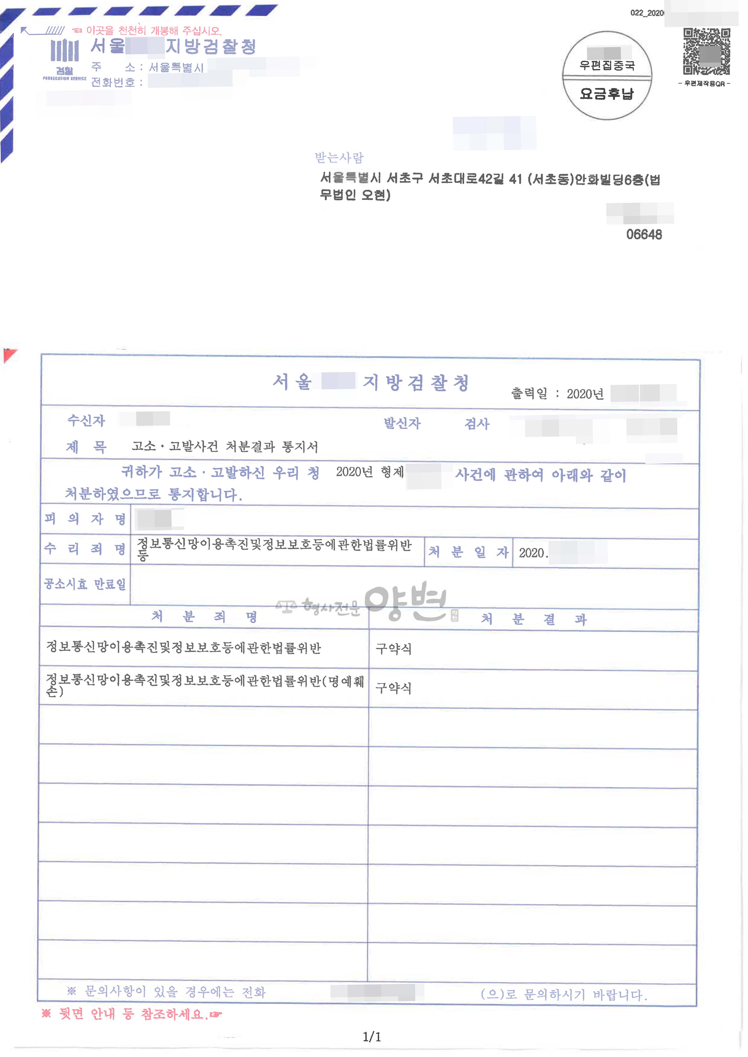 담당검사는 담벼락 게시글이 허위사실이라고 판단하고, 정보통신망법위반(불안감유발문자), 정보통신망법위반(명예훼손) 모두 혐의가 인정된다고 하면서 약식 #기소처분 하였습니다.