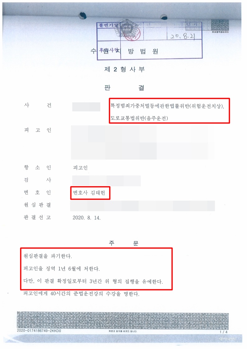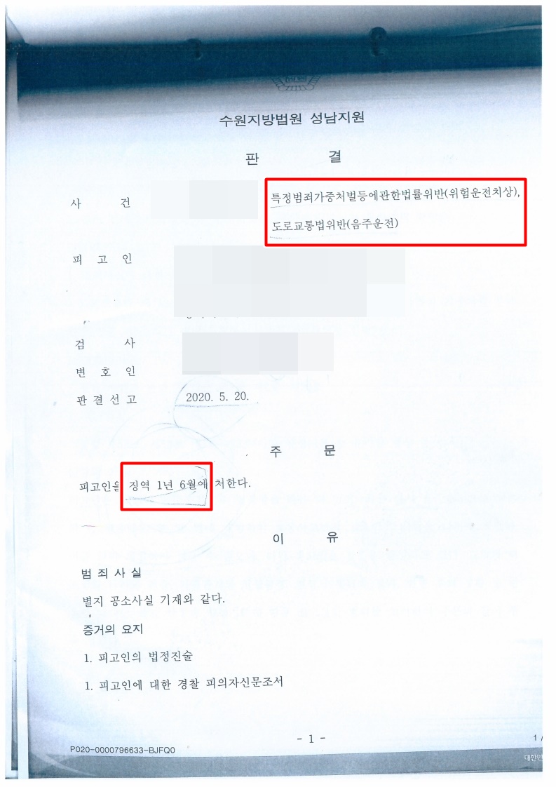 오늘은 형사사건에서 자주 처벌되고 있는 특정범죄가중처벌등에관한법률위반(위험운전치상) 및 도로교통법위반(음주운전)에 관하여 승소사례를 소개해드리겠습니다.