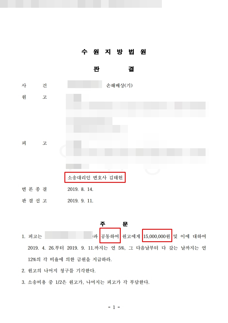 김태헌 변호사는 부당한 청구금액이라는 사실을 알고 피고를 대리하여 이미 혼인관계가 파탄이 났다는 사실, 유부녀도 공동불법행위 책임, 부정행위자체가 극히 미미하다는 사실 등을 주장하여 결국 유부녀와 공동하여 1500만원을 지급하라는 판결을 받을 수 있었습니다.