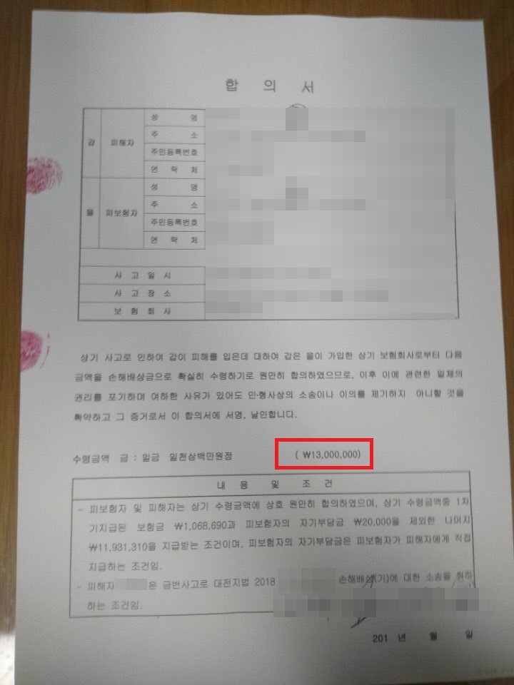 청구하여 소송을 진행하였고 약 2주 후 피고측 보험회사에서 1,300만원에 합의를 하자고 연락이 왔습니다.