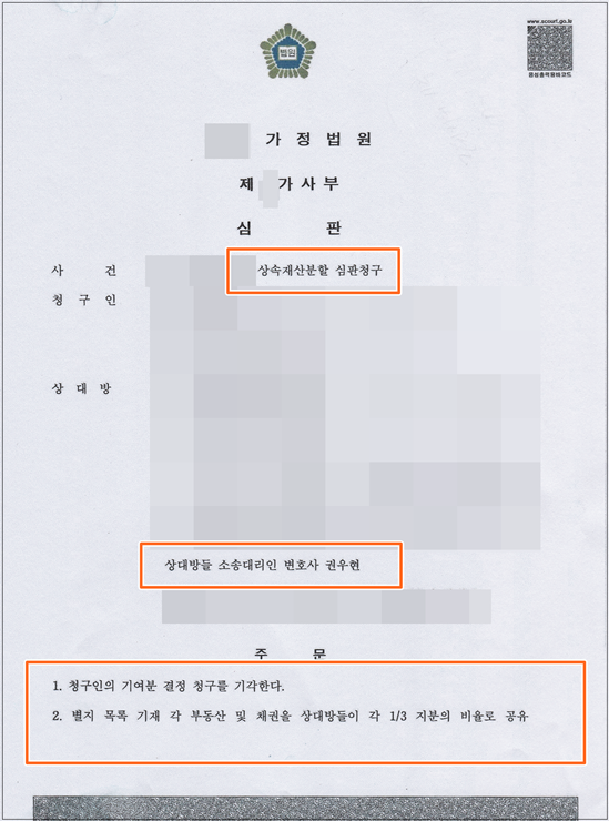 1. 상속재산분할 및 기여분결정청구사건에서 전부 승소한 사례 하나를 소개합니다.
