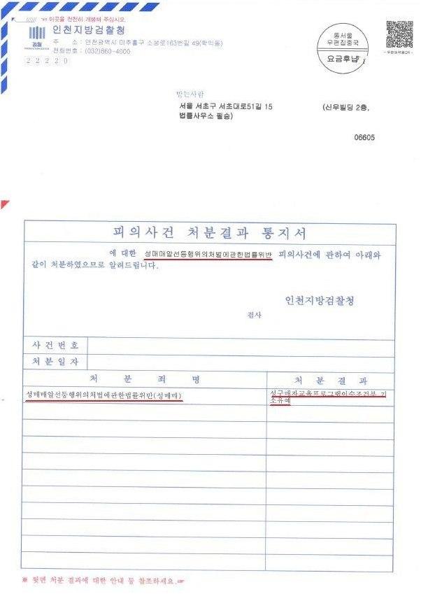 의뢰인님께서는 최근 성매매 처벌 수위에 비추어 벌금형이 선고될 위험이 높은 상황이었습니다. 그러나 앞서 말씀드린 다양한 방법으로 경찰, 검찰 수사 단계를 신중히 진행하였고 이에 인천지방검찰청은 의뢰인님에게 "교육조건부 기소유예"처분을 내렸습니다.