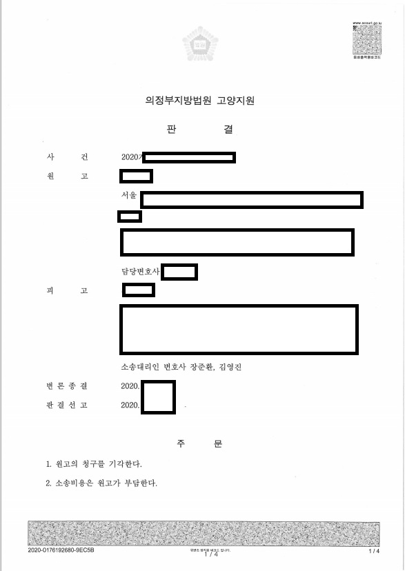 이 사안의 경우 적절한 대응을 통해 실제 사실관계를 확정할 수 있었고, 그에 따라 상대방의 청구를 기각 시킨 사례입니다.