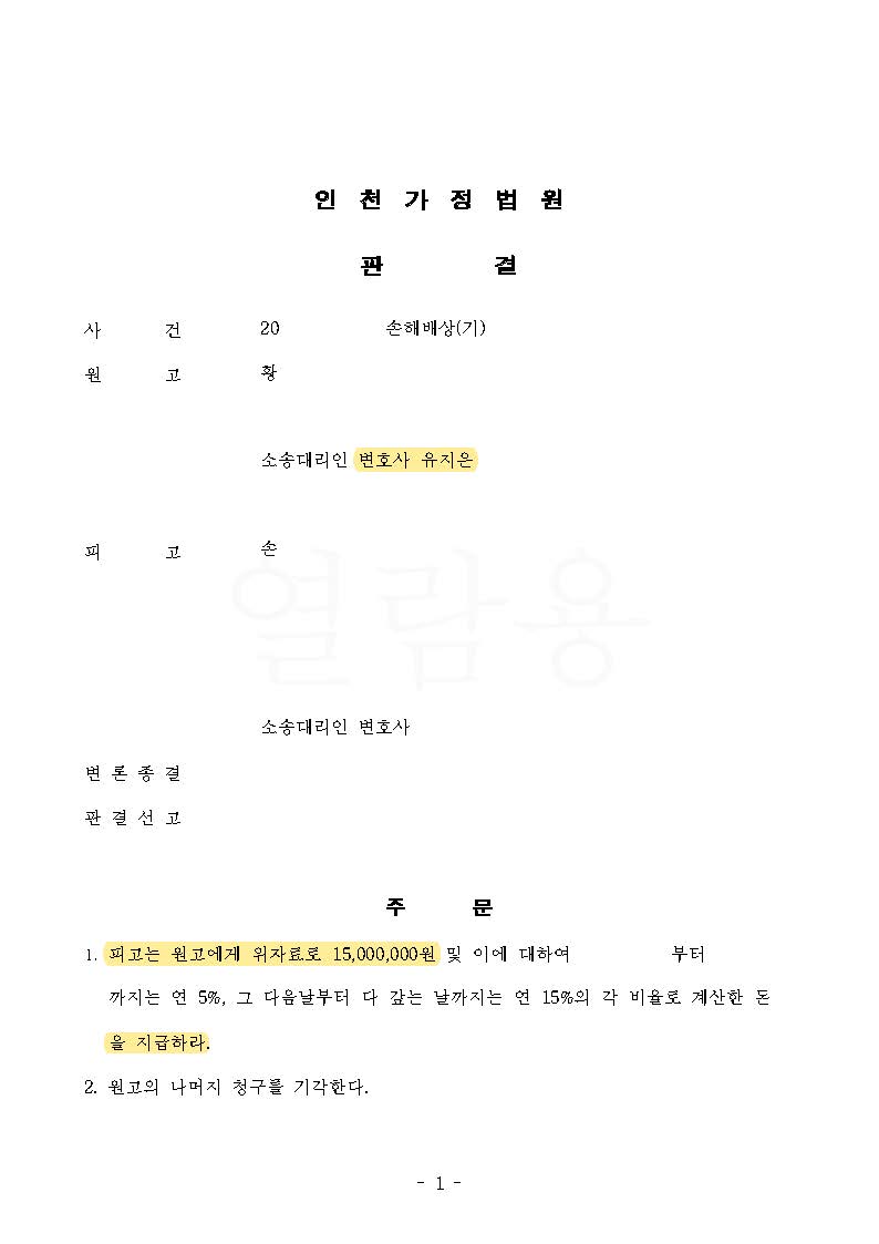 결국, 의뢰인은 남편으로부터 상당한 재산을 받은 것과 별도로 상간녀로부터 위자료로 15,000,000원을 추가로 지급받을 수 있었으며, 남편으로부터 혼인 기간 중 증여받은 부동산을 재산분할대상에서 제외하는 것이 쉽지는 않았으나 이를 제외시키고, 이와 별도로 남편으로부터 2억 5천만 원 이상을 추가로 받음으로써 좋은 결과로 마무리된 사례입니다.
