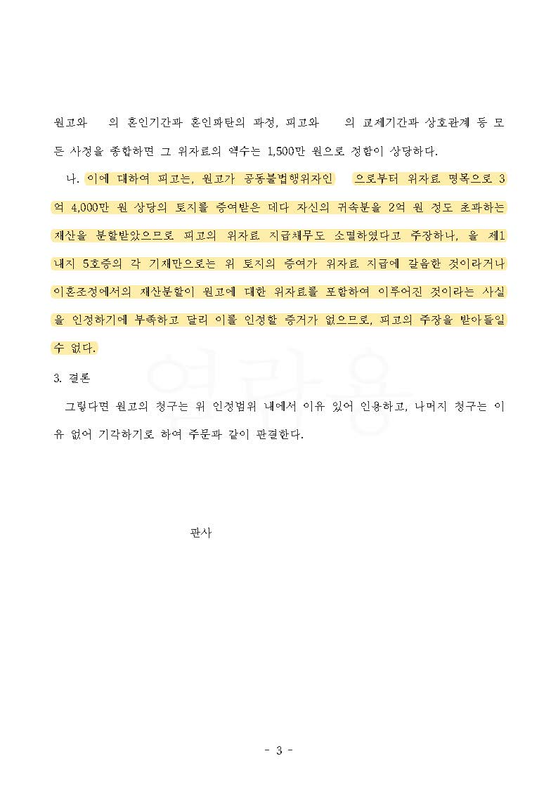 한편 손해배상 사건에서 상간녀는 의뢰인이 공동불법행위자인 남편으로부터 이미 위자료 명목으로 3억 4천만 원 상당의 토지를 이미 증여받은 데다 자신의 귀속분을 2억 원 정도 초과하는 재산을 추가로 분할 받았으므로 위자료 지급 채무가 없다고 주장하였습니다.