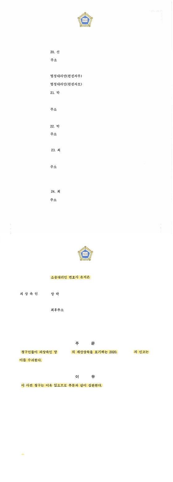 선순위 상속인들이 모두 상속포기를 할 경우 후순위 상속인들이 망인의 채무를 떠안기 때문에, 상담 끝에 의뢰인의 요구 사항을 반영하여 현재 연락이 가능한 4촌 이내의 방계혈족까지 모두 상속포기를 하기로 하였고, 미성년자를 포함하여 법원에 24명에 대한 상속포기를 동시에 청구하였습니다.