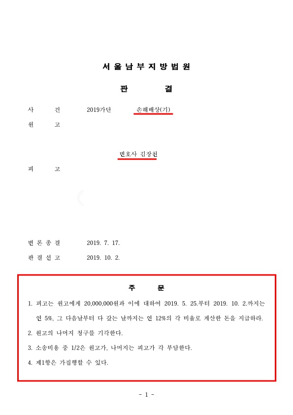 "'피고는 원고에게 2천만 원을 지급하라"는 판결이 확정되었습니다.