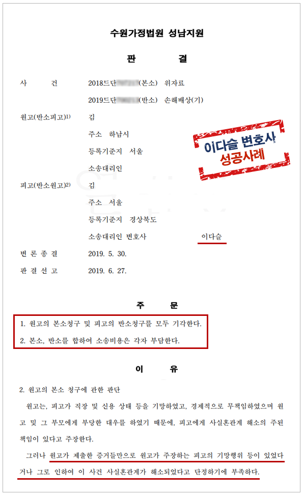 이에 이혼전문변호사인 이다슬 대표 변호사는 피고가 된 A씨의 법률대리를 맡아 즉각 반소를 제기하며 B씨의 주장에 반박대응하였고 재판부 또한 피고 측의 이러한 주장을 받아들여 B씨의 청구를 기각시킨 사례입니다.