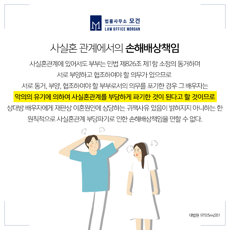 그런데 B씨가 'A씨가 직장 및 신용 상태 등을 기망하였고, 경제적으로 무책임하고 자신과 부모에게 부당한 대우를 하였다' 며 사실혼 관계 해소의 주된 책임이 B씨에게 있다고 주장하며 5,000만원의 위자료청구소송을 제기하였습니다.