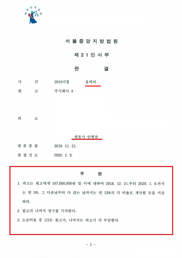 변호인은 기성고 상담의 용역비를 제외한 나머지 해당 업체의 청구를 모두 기각시켜 의뢰인이 178,000,000 원 및 이자, 지연손해금, 변호사비용 지출을 막아드렸습니다. 또한, 상대방은 항소를 포기하여 사건을 종결시켰습니다.