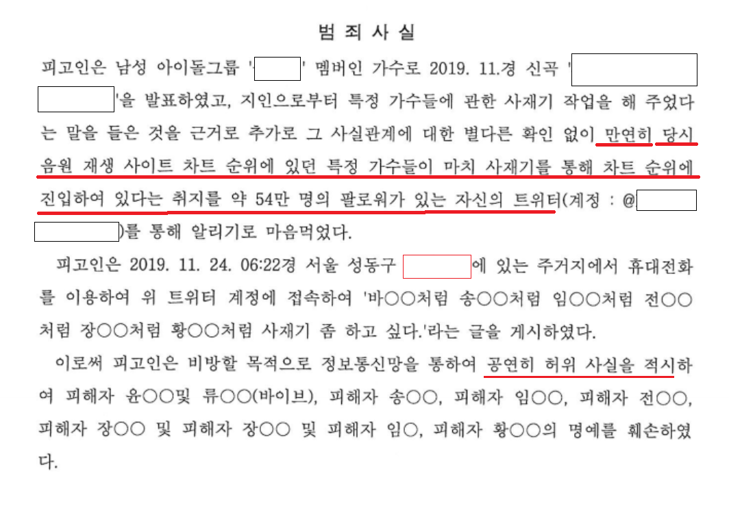 당시 차트에 있는 가수들이 사재기를 했다고 트위터에 게시하여 "허위사실"을 유포한 행위