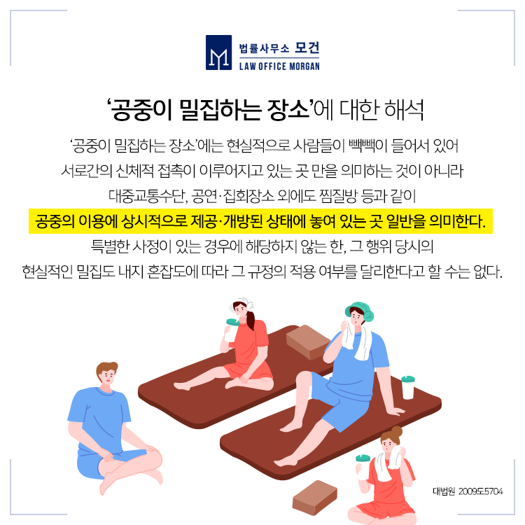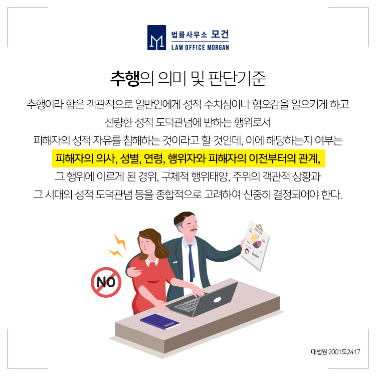 광화문/을지로/동대문 법률사무소 모건의 이다슬 대표 변호사는 공중밀집장소에서의 추행 혐의를 받은 의뢰인의 변호를 맡아 무죄를 이끌어 낸 성공사례를 보유하고 있습니다. 관련 상담이 필요하신 분들이라면 법률사무소 모건으로 문의하시기 바랍니다.