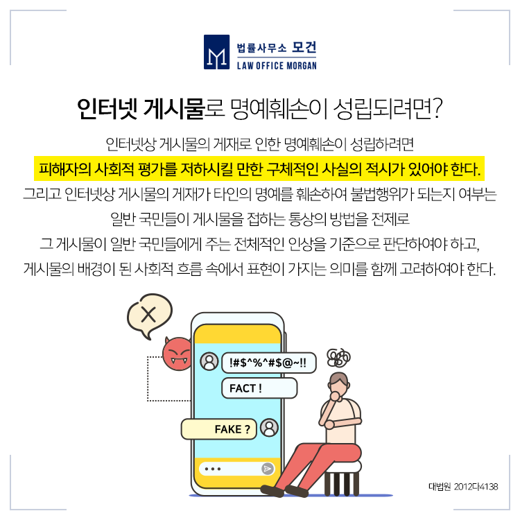 또한 이러한 명예훼손으로 재산상 손해, 정신적 손해에 대해서도 그 권리 행사를 다하기 위해 의뢰인을 대리한 적극적인 법률대응을 도와드리고 있습니다. 이와 관련한 법률상담이 필요하신 분들은 명예훼손죄의 다수의 승소, 성공사례를 갖춘 종로 법률사무소 모건으로 문의하시기 바랍니다.