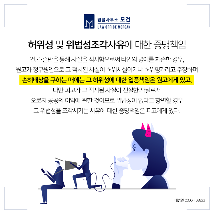 민사소송에서는 그 사건에 따라 그 입증책임이 누구에게 있는지가 상이하므로 이러한 법리에 따른 소송을 준비하는 것이 소송의 승패를 가를 정도로 상당이 중요한데요. 가해자가 타인의 명예를 훼손한 경우, 이에 가해자로부터 적시된 사실에 따른 손해배상을 구할 때에 그것이 허위사실이라거나 악의에 기한 것임에 대한 입증책임은 소송을 제기하는 원고에게 있습니다.