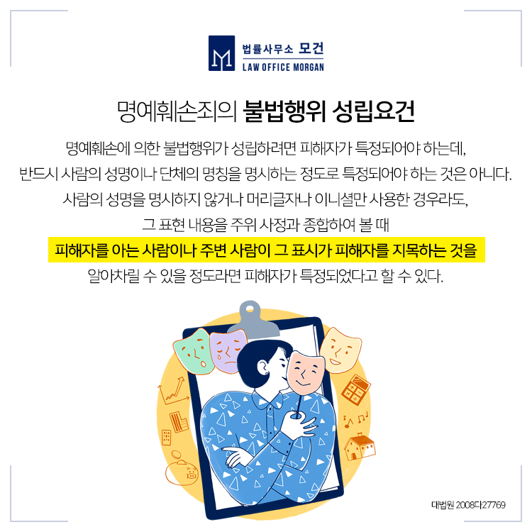 또한 피해자가 특정되어 꼭 성명을 명시하지 않거나 머리글자나 이니셜만 사용한 경우라도, 표현 내용을 주위 사정과 종합하여 볼 때 피해자를 아는 사람이나 주변 사람이 그 표시가 피해자를 지목하는 것을 알아차릴 수 있을 정도로 피해자가 특정되었다면 가해자를 상대로 명예훼손에 대한 책임을 물을 수 있습니다.